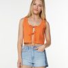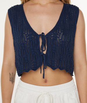 Make a beachy spring statement in the Beach Bound Crochet Vest. With its dip neck and tie-front details. this piece is the perfect addition to the spring rotation.