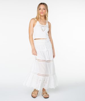 A fresh take on a summer skirt. the Castaway Maxi makes a statement while easily being a staple. Featuring flirty cutout details and an accented drawstring waist. this skirt is perfect for any coastal occasion.