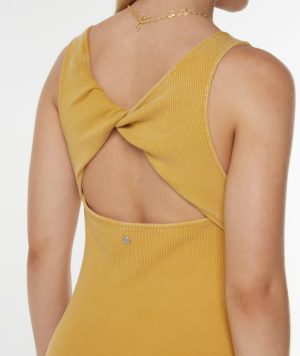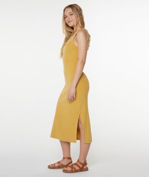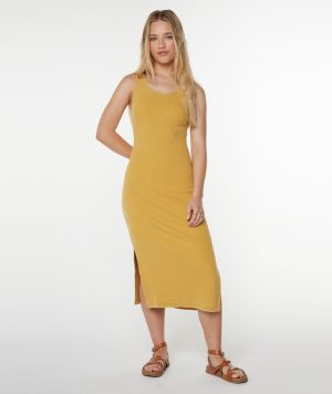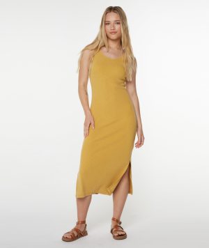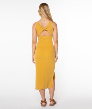 The City Lights dress gives your go-to midi a beachy refresh. Made from soft. garment-washed stretch cotton rib. it features a flirty open back and leg slits—an effortlessly elevated staple for warm days.